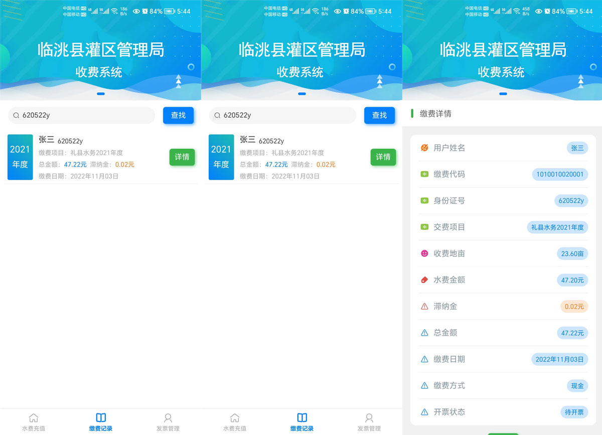 灌區(qū)收費(fèi)系統(tǒng)運(yùn)用計(jì)算機(jī)應(yīng)用技術(shù)以及相關(guān)的專用分析軟件和通訊網(wǎng)絡(luò)所組成的一個(gè)綜合性的收費(fèi)系統(tǒng)。通過對流經(jīng)用水戶的灌溉 時(shí)間以及流量的輸入,計(jì)算出該用水戶的水費(fèi),生成收費(fèi)賬單提交至上級審核 ,審核通過即可在線繳費(fèi)以及他人代繳功能。管理單位可以在手機(jī)和電腦網(wǎng)頁上同步查詢相應(yīng)的用水量以及繳費(fèi)情況。